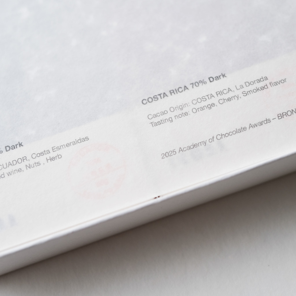 말린 체리와 오렌지를 떠올리게 하는 선명한 과일 산미가 초반부터 또렷하게 느껴지며, 70% 함량에서 코스타리카 카카오의 개성을